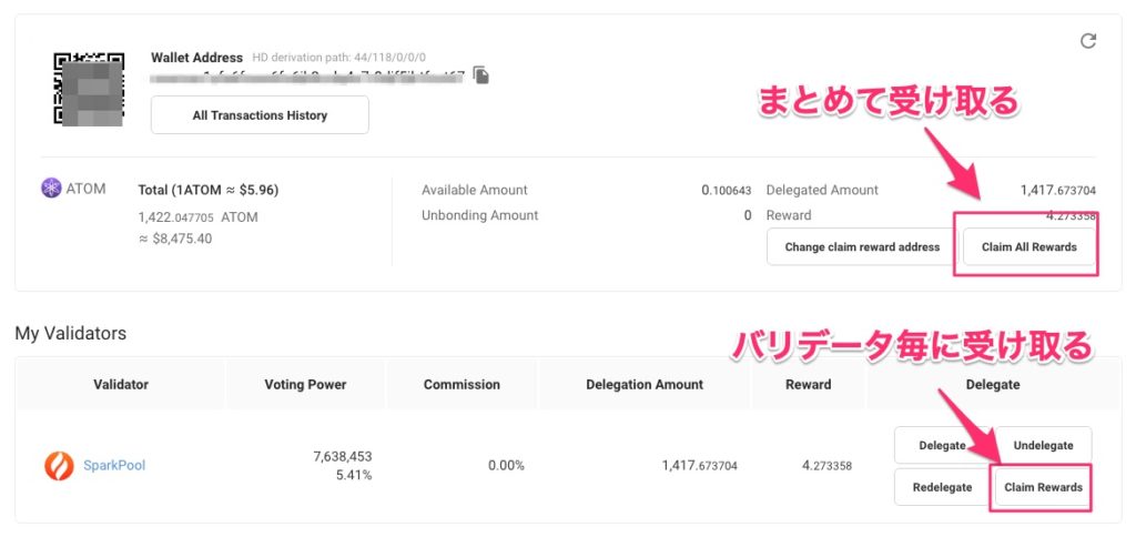 受け取りの際には「Claim All Reward」を使うのが便利、複数のバリデータにある報酬を一括で受け取ることができます。