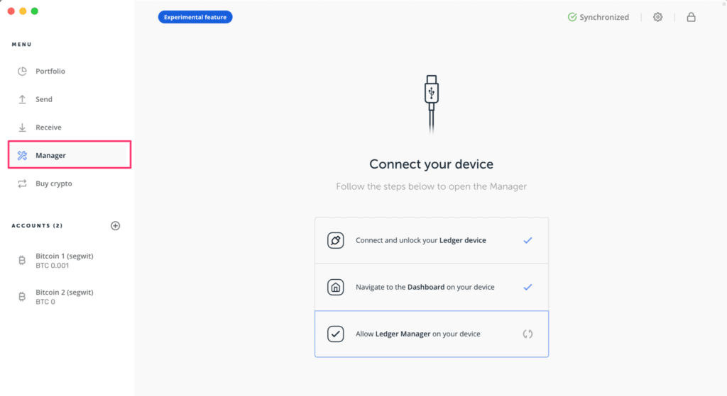 開発者モードにした状態でLedgerを接続しマネージャーを開きます。