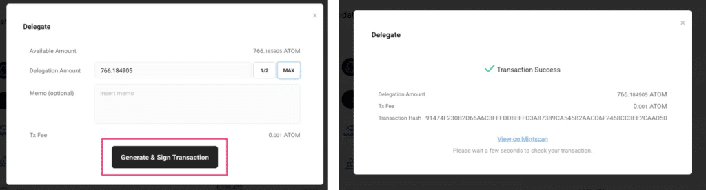 デリゲート先を決定したらATOMの数量を入力して「Generate & Sign Transaction」をクリック。