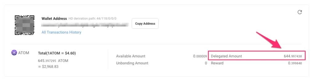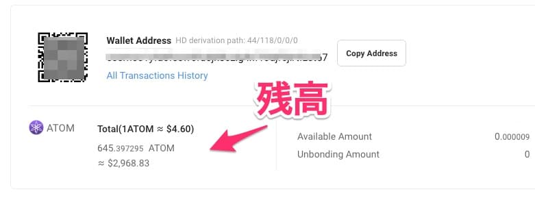 ウォレット情報に「Delegated Amount」と表示されてる部分が自分のデリゲートしているATOMの数量です。