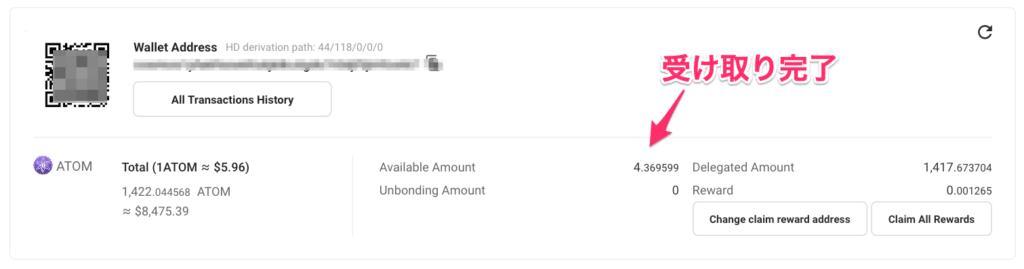 自分のウォレットの「Availbale Amount」に残高が移動すれば受け取りが完了です。