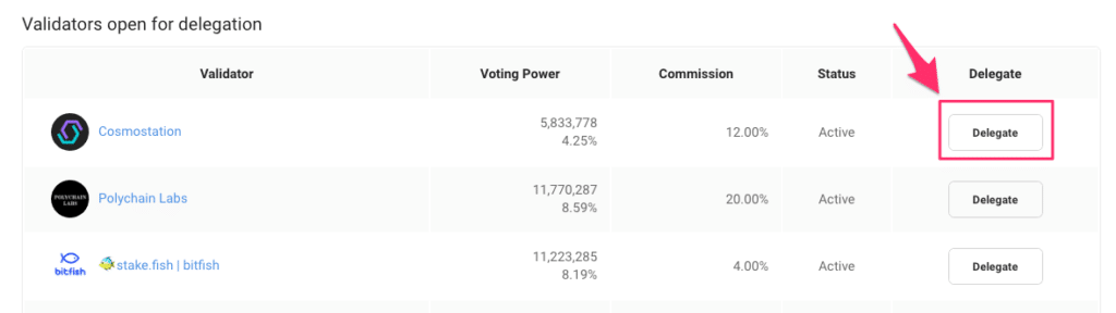 ウォレット画面の下にバリデータ(Validator)の一覧があるのでデリゲート先を選択します。