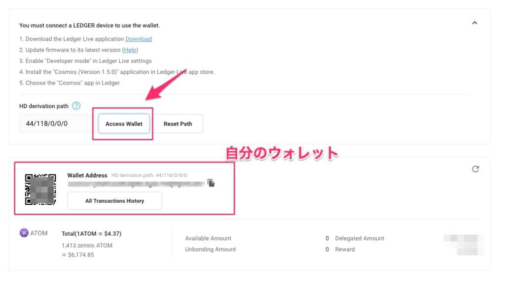 こちらのリンクからハードウォレットを接続し、ウォレットへアクセスします。