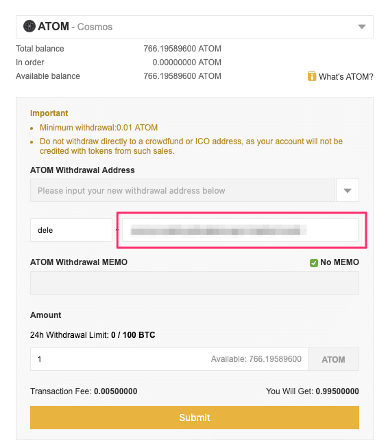 BinanceでATOMの出金をするときに先ほどのCosmosアドレスを入れましょう。