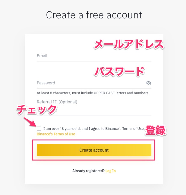 メールアドレス、パスワード、チェックボックスへのチェックをして「Create account(アカウント登録)」をクリックします。