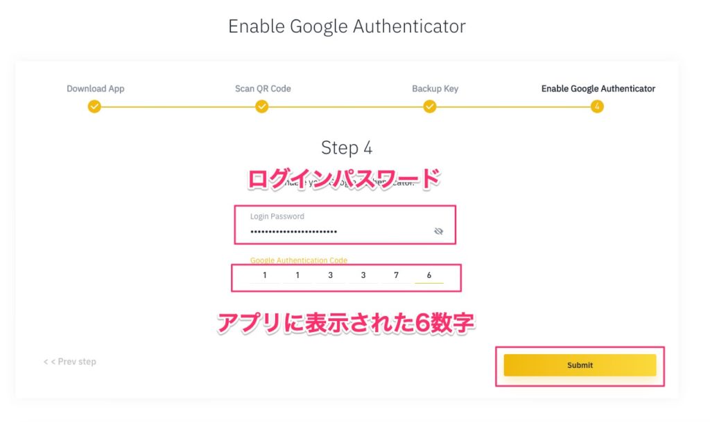 コードのメモが完了したら、最後に「ログインパスワード」「スマホのGoogleアプリに表示される6桁の数字」を入力して「Submit(完了)」をクリックします。