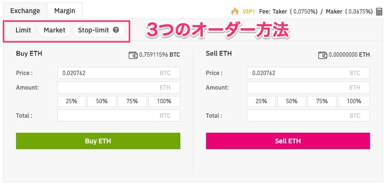 - Limit(指値):自分の決めた価格で売買したい時に使う