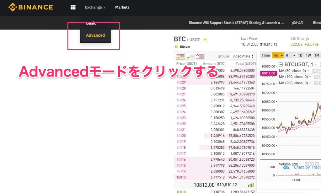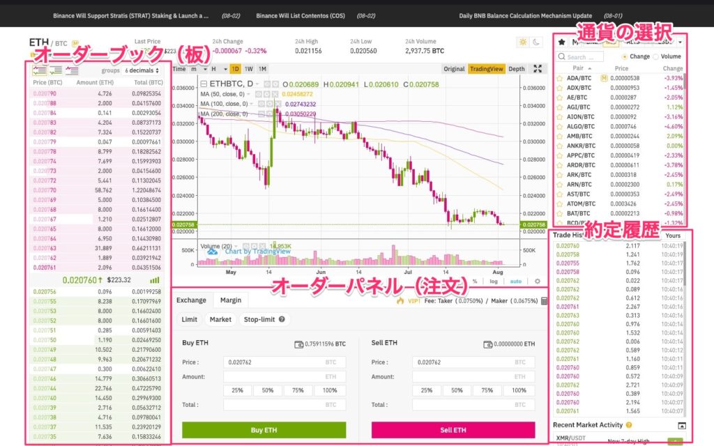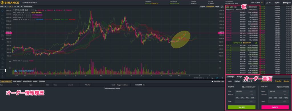 バイナンスのトレード画面レイアウト、各種機能の解説