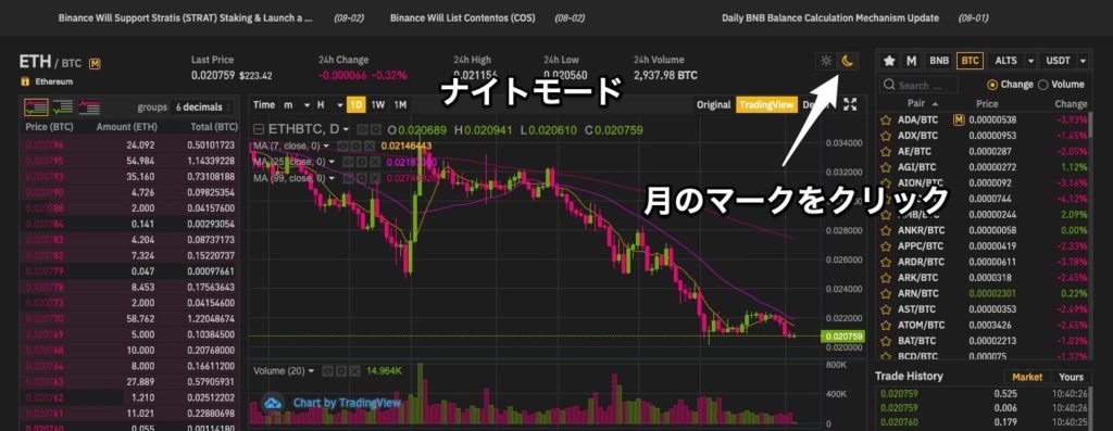 チャートの上部にある「🌙」のマークをクリックするとナイトモードになります。