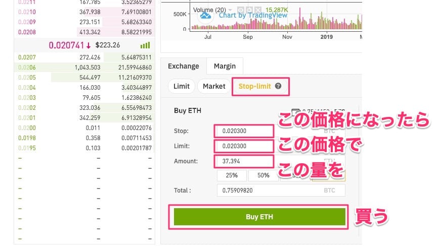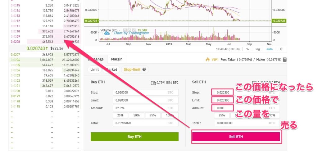 例えば「ビットコインの価格が100万円を下回ったら101万円で売却する」こんな条件付で注文したいような時に使います。
