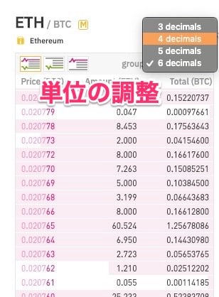 画面左のオーダーブックの上部にある、ダイアログで小数点単位の調整ができます。