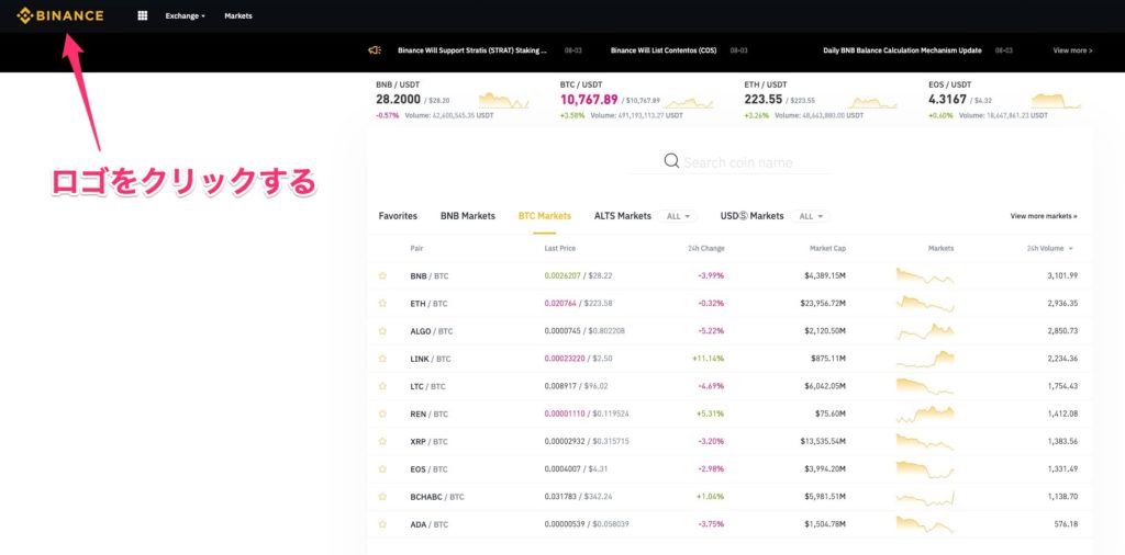 どのページで左上にあるBinanceロゴをクリックするとトップページにいけます。