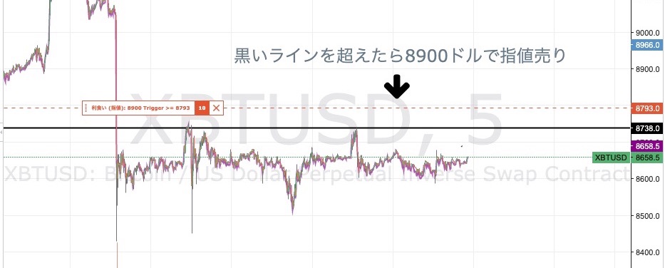 主に「この価格以上(以下)になったら注文したい」という時に使います。注文を設定するとBitMEXのチャート上にこのように注文が表示されます。