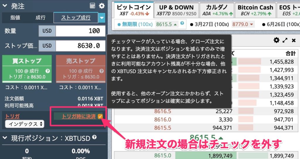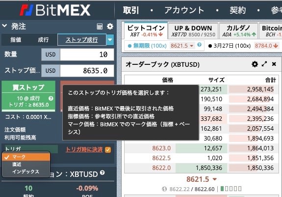 具体的にBitMEXの画面でのトレイリングストップ注文を解説していきます。