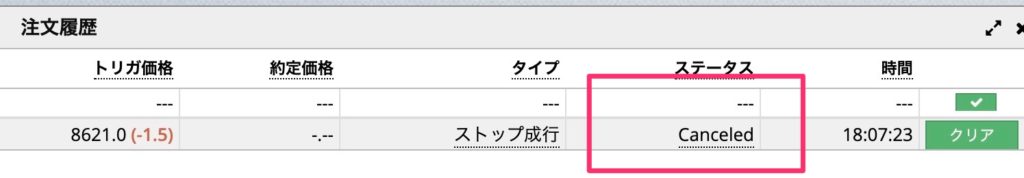 チェックを外さなかった場合このように「Cancled」と注文が成立しない場合があります。