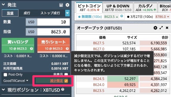 減少限定は現在のポジションを減らす注文に限定するオプションです。