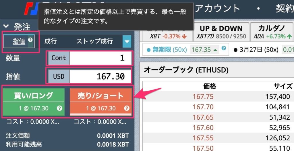 ビットコインとイーサリアムの無期限契約はUSD(ドル)単位で注文します。