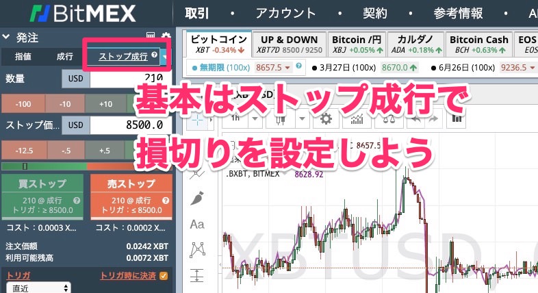 ビットコインが自分の予想と逆行した場合に備えて損切りを「ストップ成行」で設定しておきましょう。