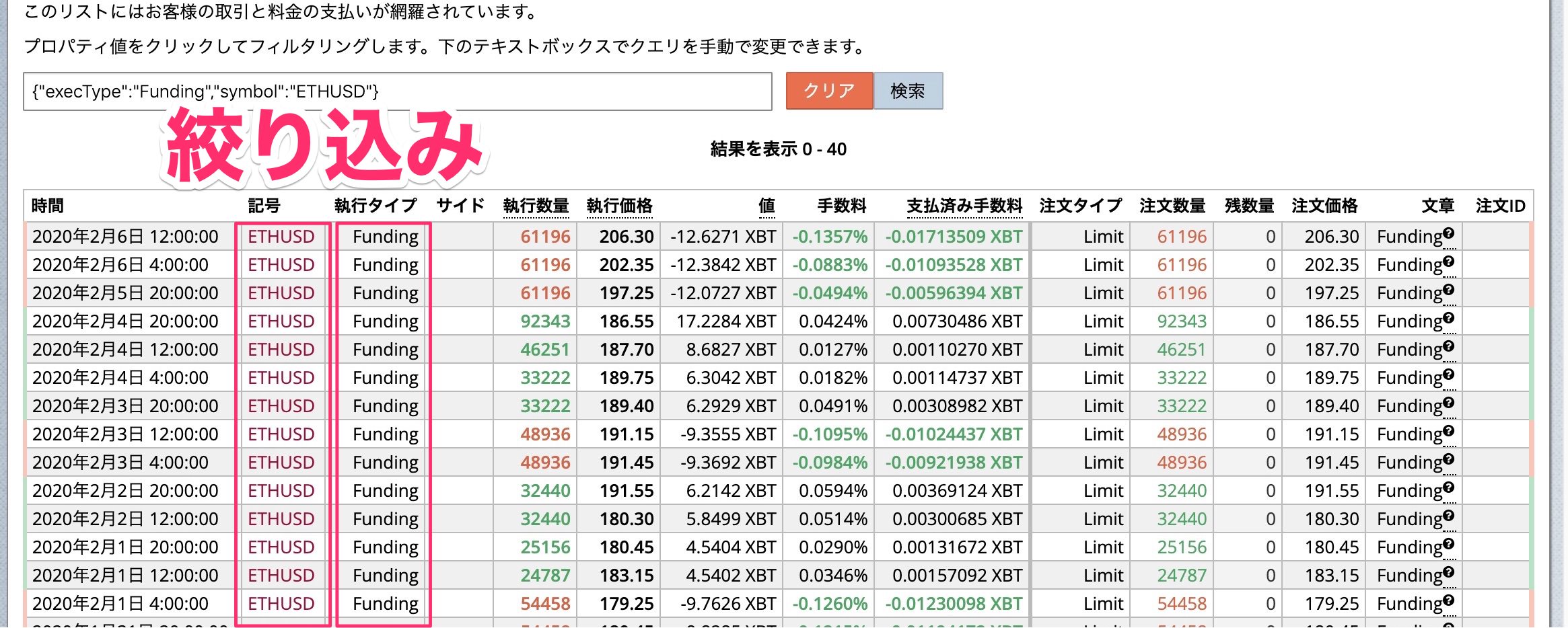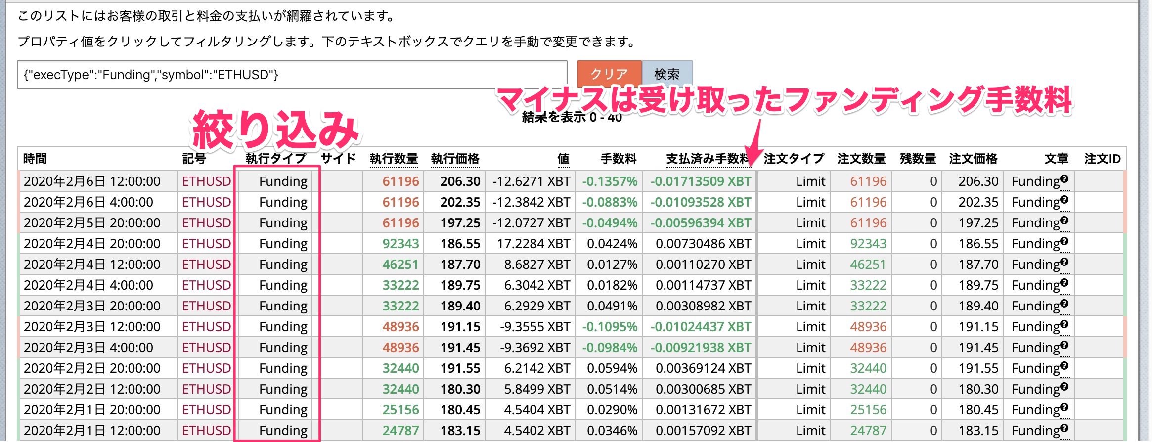 執行タイプの部分でFundingをクリックするとファンディング手数料に絞り込むことができます。