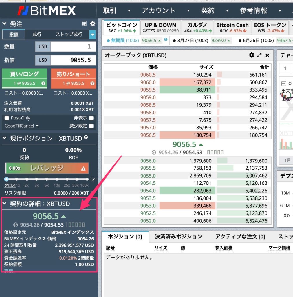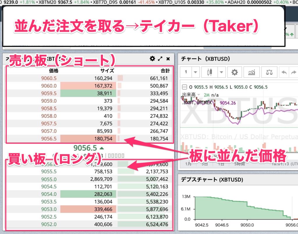 BitMEXではプレイヤーのオーダーをまとめたオーダーブックがあります。(画像中央部)