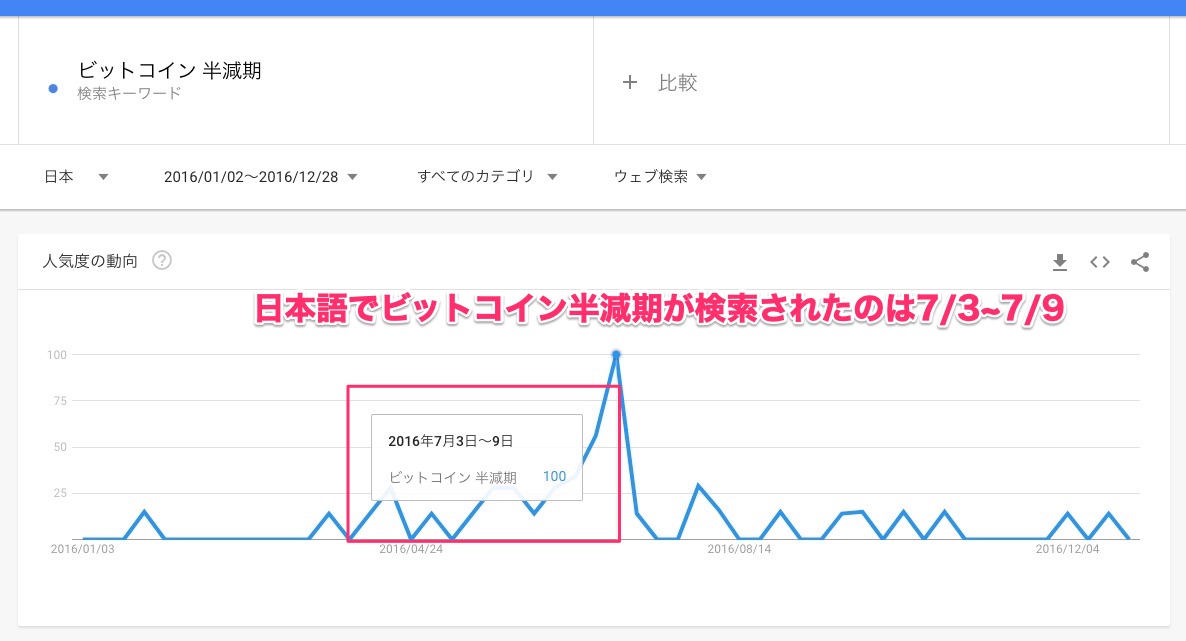 2016年の半減期の際に「ビットコイン 半減期」でもっとも検索された時期は7/3〜7/9でした。