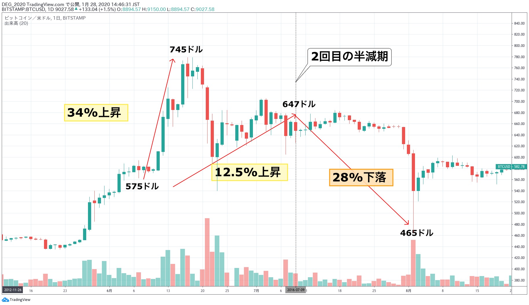 2回目のビットコイン半減期は2016年7月9日に起こりました。1ヶ月前の価格は575ドルで半減期当日は647ドル、12.5%の上昇。