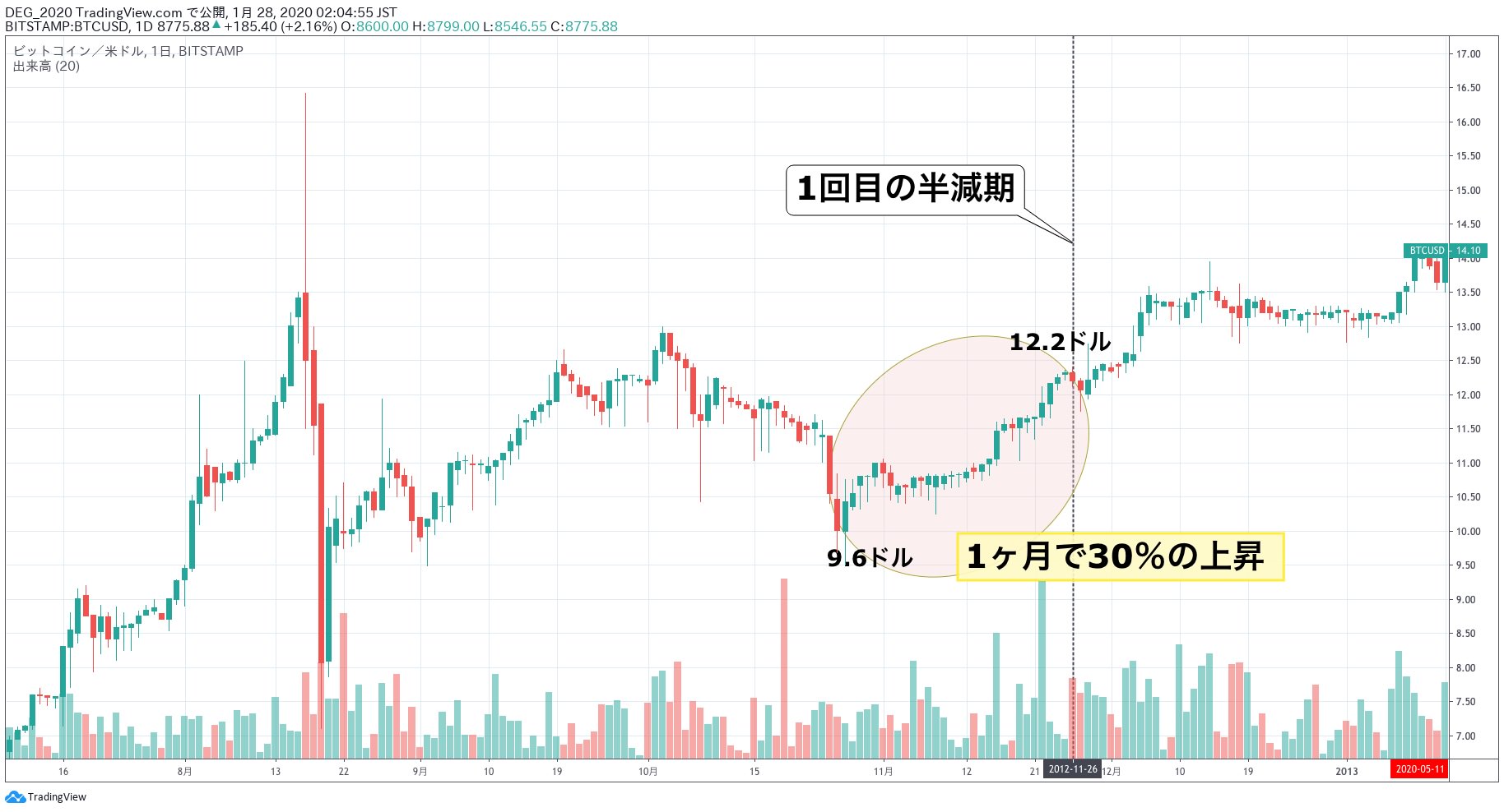 1回目のビットコイン半減期は2012年11月26日でした。1ヶ月前の価格は9.6ドルで半減期当日は12.2ドル、期間中に30%の上昇をしました。