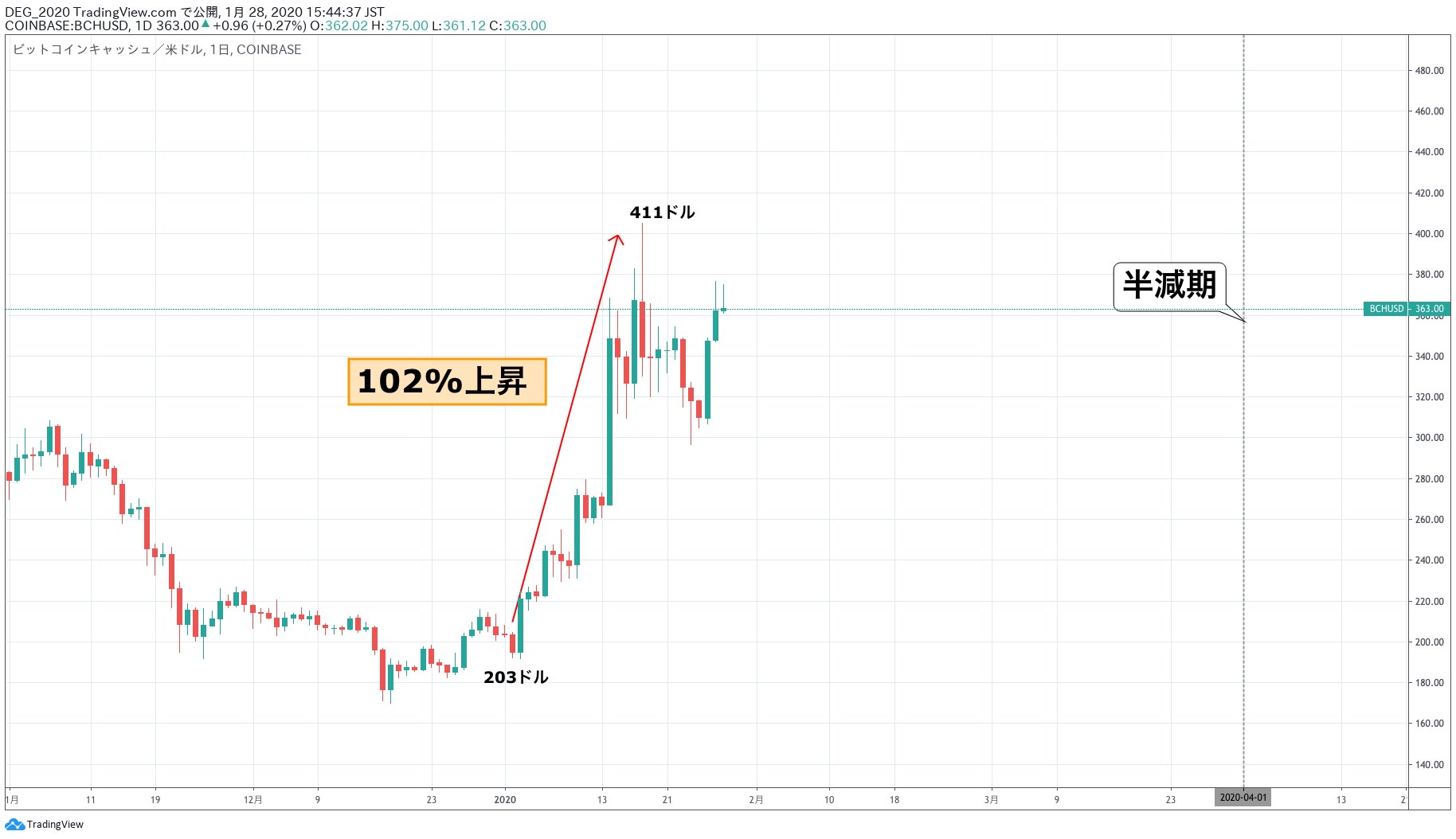 BCHは2020年からすでに102%(2倍)の高騰をみせて相場を牽引しています。ほぼ間違いなく「半減期相場の先例」としてBCHのチャートは世間に広がるはずです。