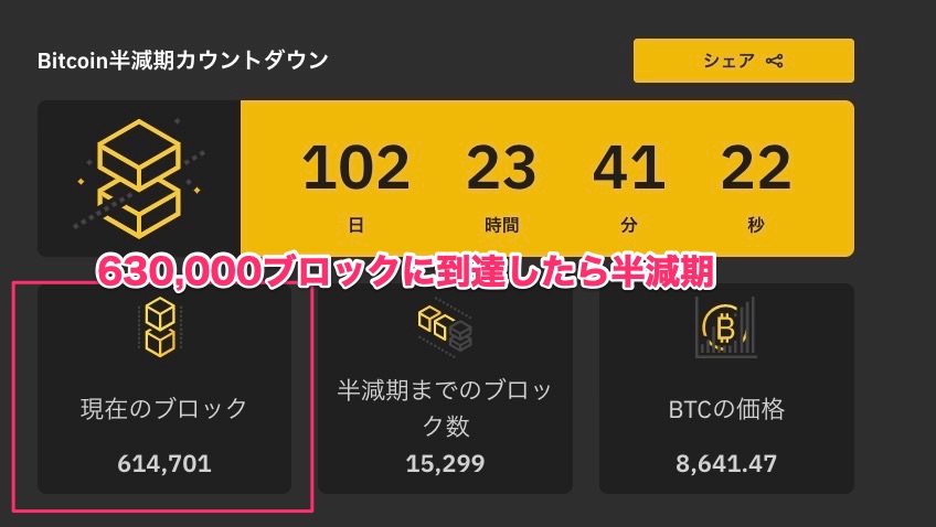 なのでビットコインの3回目の半減期の正確な時期は「ビットコインのブロックが63万に到達したら」になります。
