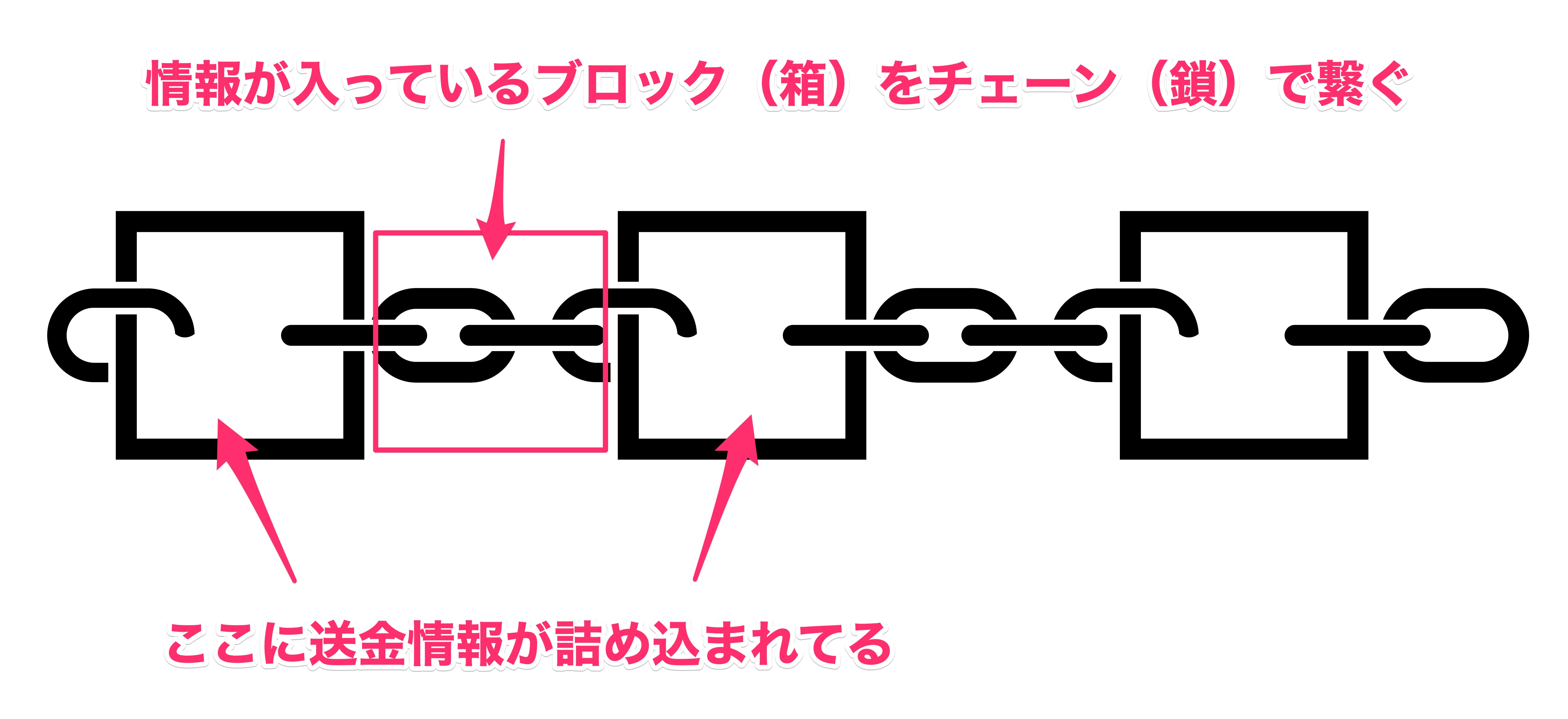 ビットコインはブロックチェーンの仕組みを使って動いています。ブロックチェーンはブロック(箱)をチェーン(鎖)で繋いでいく仕組みです。