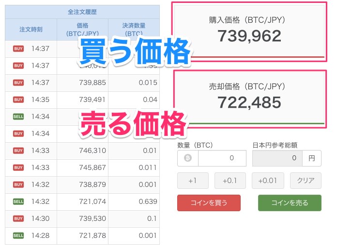 以下は実際のビットコイン販売所の画面ですがビットコインを「買う/売る」価格が表示されています。