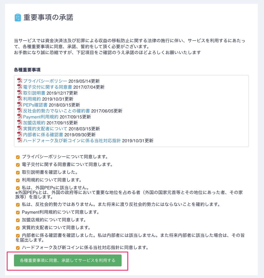 「各種重要事項を確認する」から重要事項の承諾をしていきましょう。利用規約や反社会勢力でないことの確約などがPDFの資料で用意されています。
