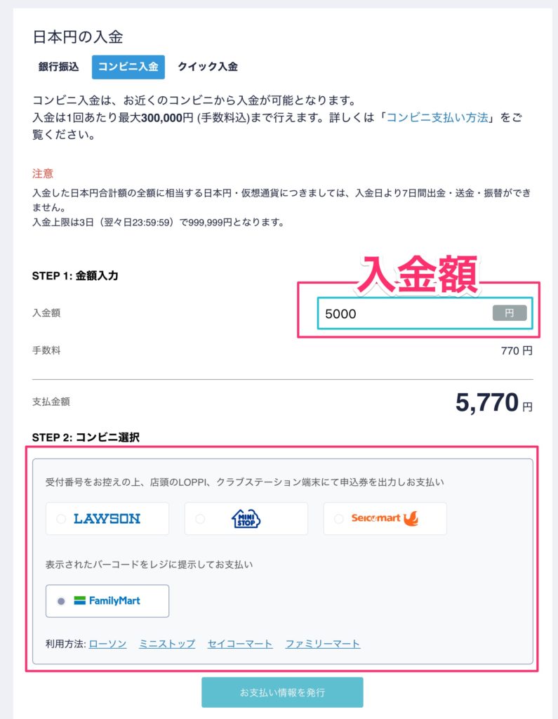 入金額を指定して、ローソンやファミリーマートにある端末で支払いをすればコインチェックへの入金ができます。