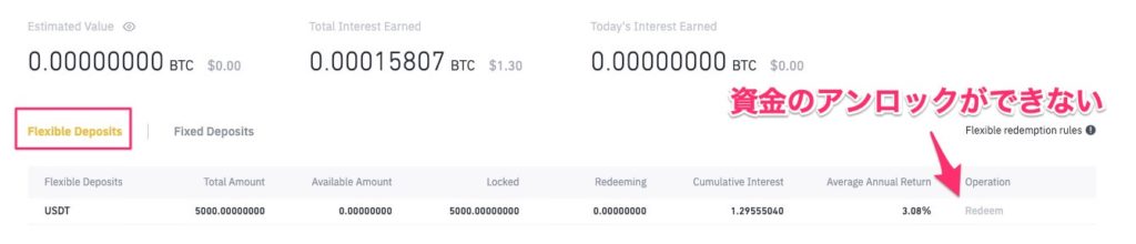 なお資金を預けた直後に貸付状況を確認しても「Redeem(償還)」というボタンがグレーバックになっています。