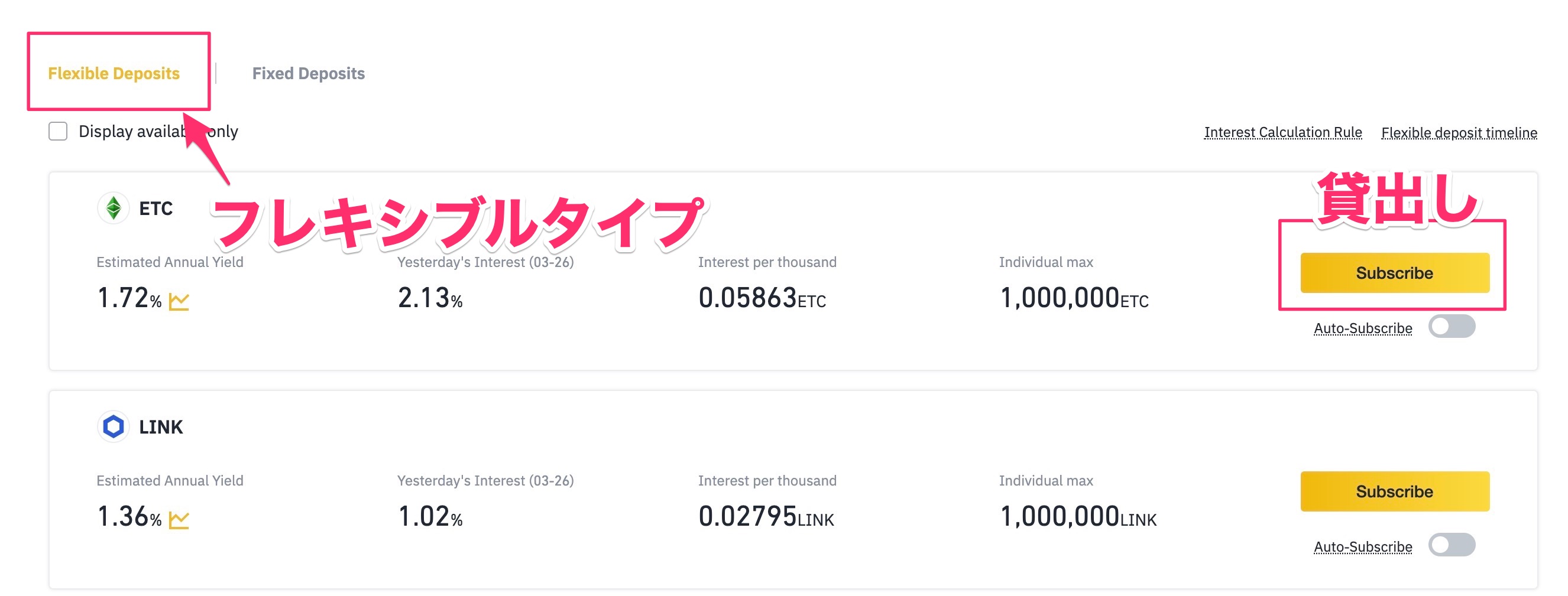 Flexible Depositsの欄では右にある「Subscribe」が黄色表示になっているものがいつでもレンディングできます。