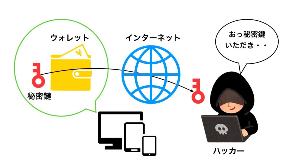 まさにそこに危険性が潜んでおりインターネット経由でPC・スマフォにある秘密鍵盗みとられる可能性があります。