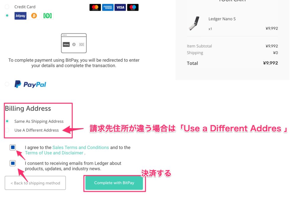 決済方法を選択したら請求先住所の入力(発送先と同一なら不要)と利用規約にチェックを入れて「Complete with ○○(決済方法)」で決済をします。