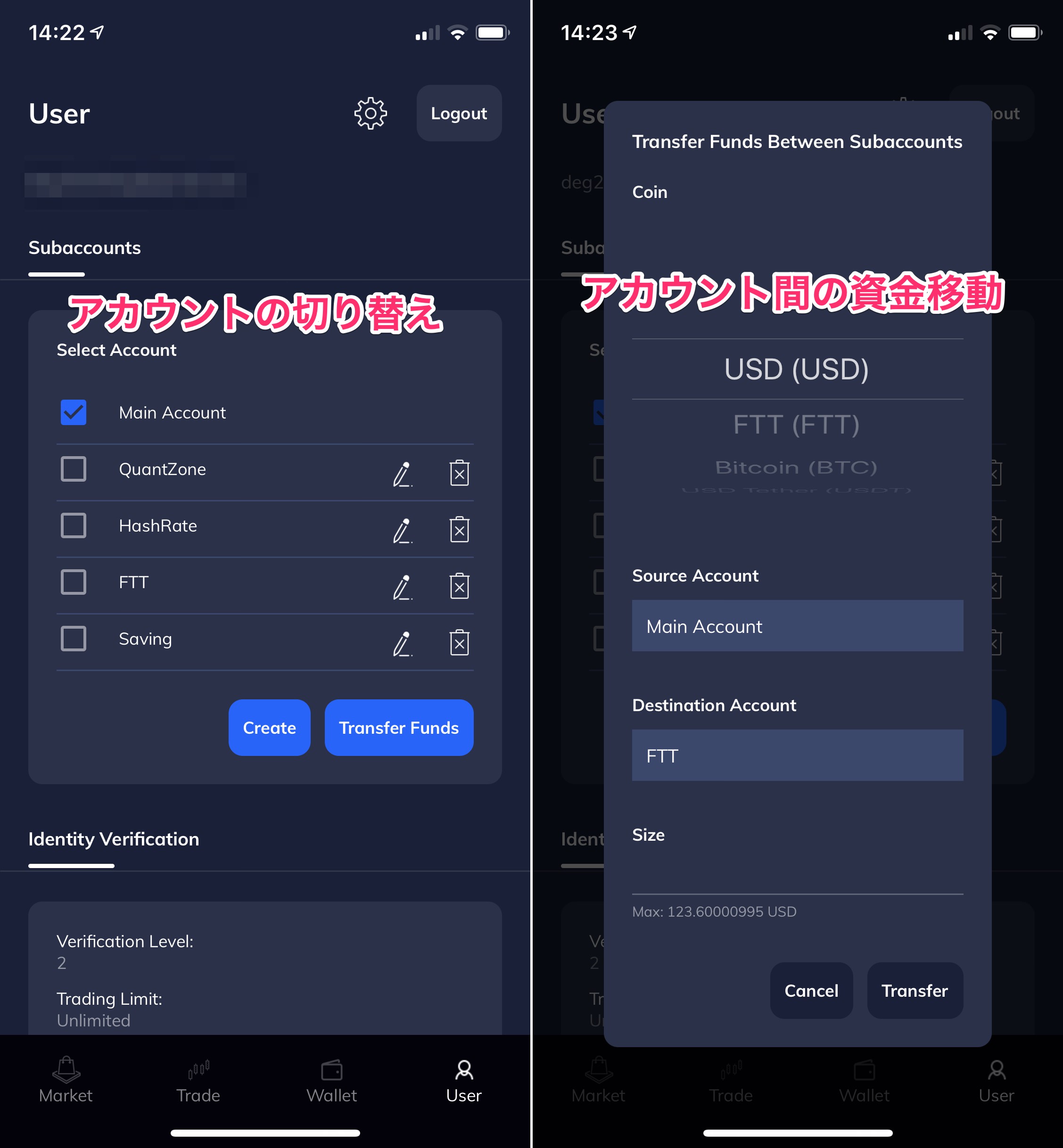 自分はFTXのサブアカウント機能をフルに使っているのですが、アプリで簡単に切り替えができるのはかなり嬉しいです。