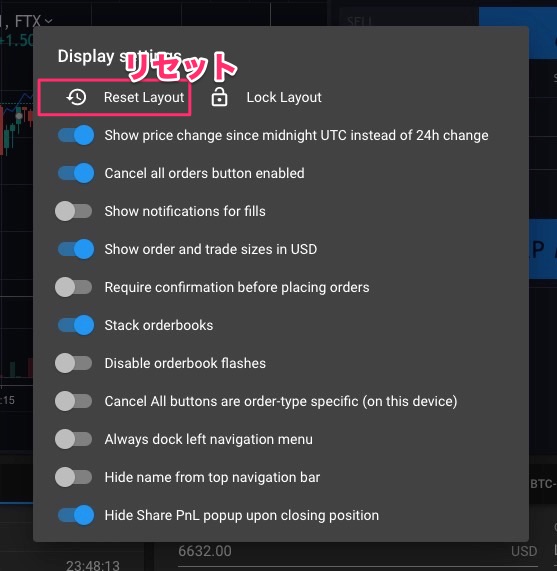 設定画面では板をUSD or BTC数量どちらで表示するかなど、いろいろな細かい設定ができるようになっています。
