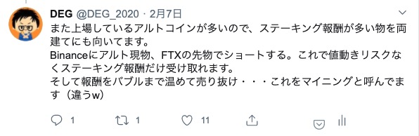 専門的な話になりますが、アルトコインを両建てして低リスクで利回りを稼ぐことができます。例えばCosmosのATOMというアルトコインはバイナンスに預けておくと年間6~9%の利回りです。