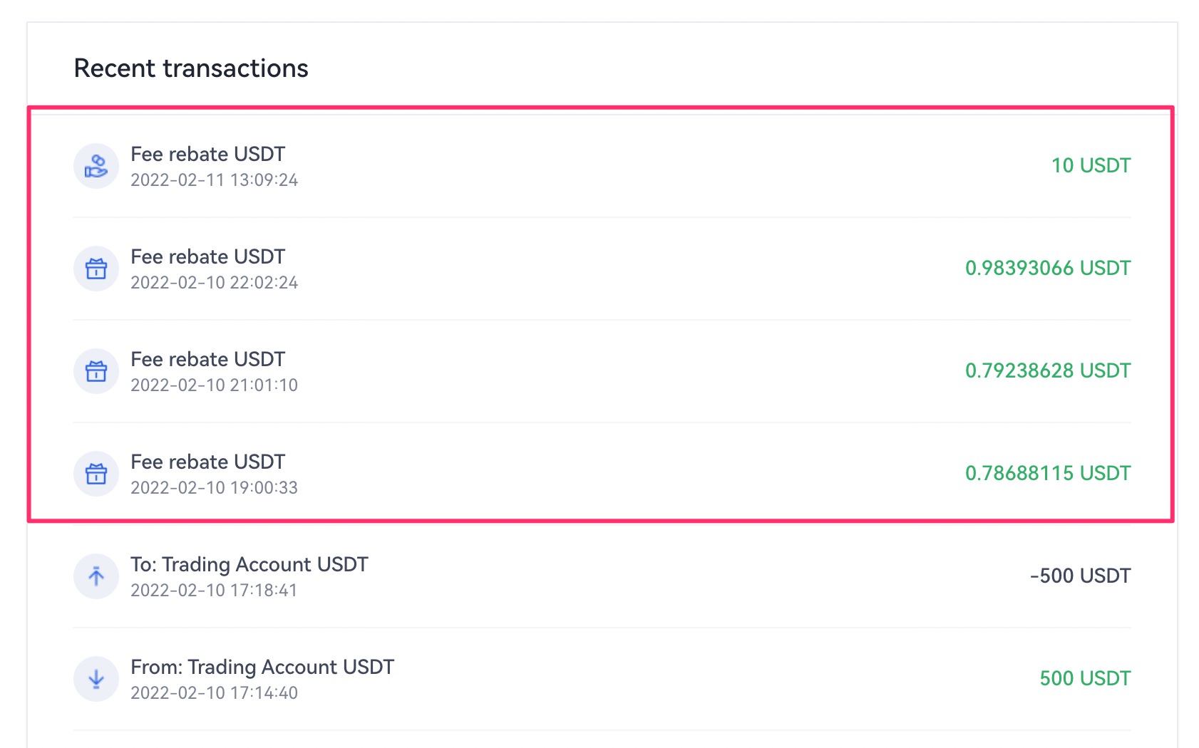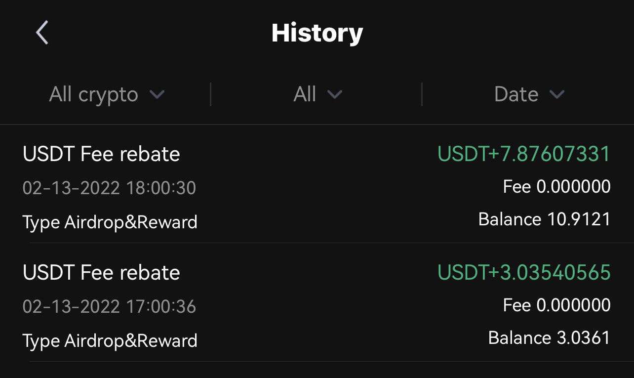 適用されていれば、こんなふうに取引のたびに「Fee rebate」という項目で20%分の手数料が常にキックバックされます。(反映には数時間かかります)