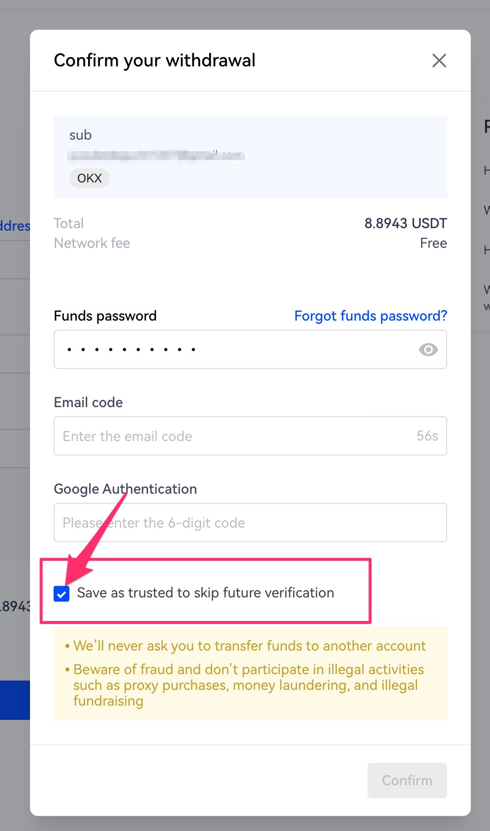 送金する際に下の方にある「Save as trusted~」をチェックしておけば、出金先を信用リストへ追加できるため次回以降は出金パスワードの入力などは不要になります。