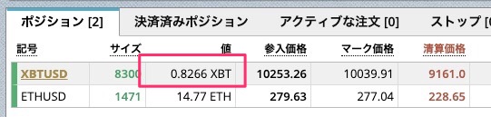 値の欄に0.8266XBTとありこれがポジションのBTC価格です。