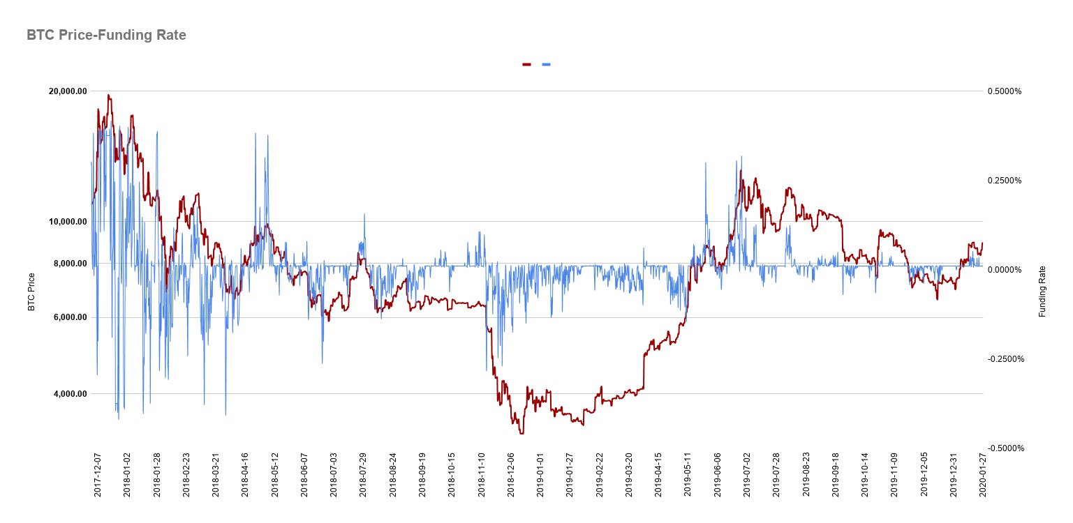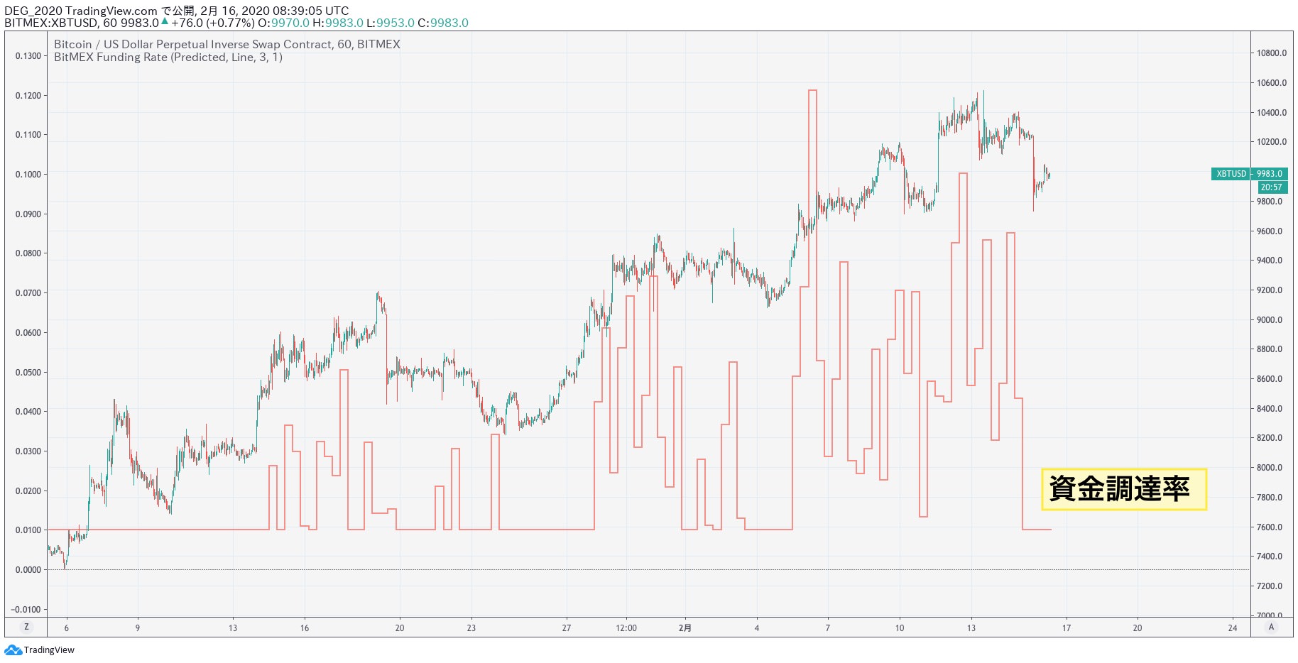 以下はBiTMEXのBTC2020年1月〜2月の1時間足チャート、赤線は資金調達率を表しています。