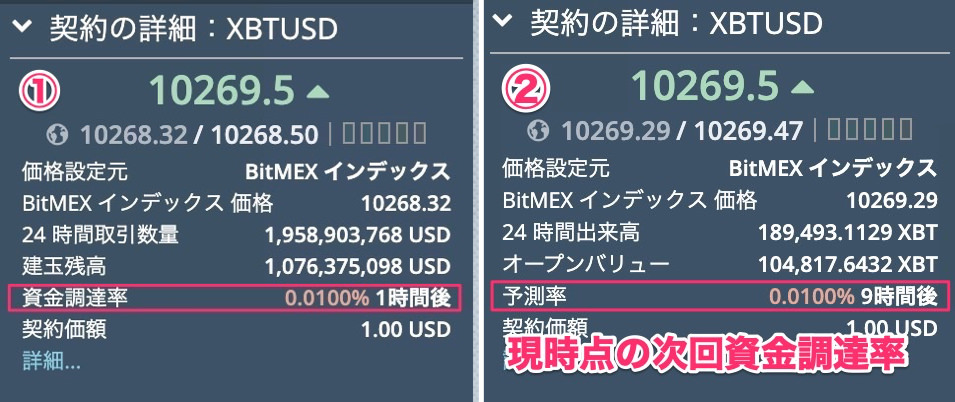 資金調達率はファンディング手数料を計算するために使われる料率です。「〜%」という形で表記され、BitMEXトレード画面に表示されているものです。