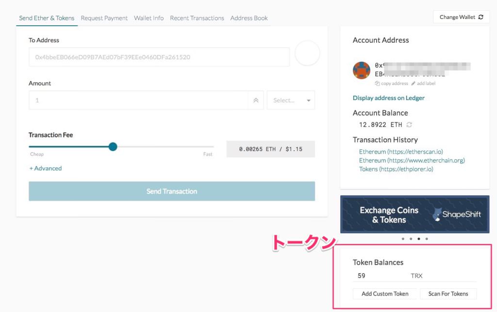 「Scan For Tokens」をクリックすると、イーサ系のトークンが表示されます。
