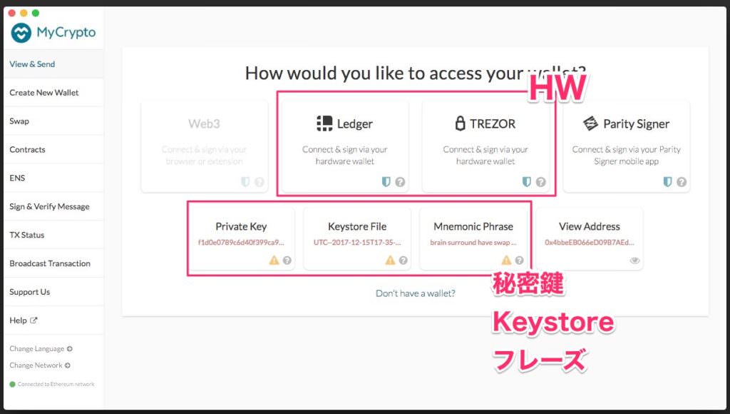 こちらはWeb版とは違い秘密鍵、Keystore、ニーモニックフレーズでのアクセスが可能。