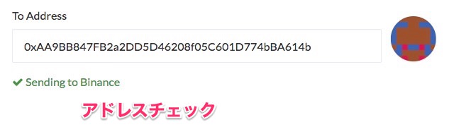 送金アドレスにBinanceの入金アドレスを入力したとき👇このように「✓Sending to Binance」と表示されます。