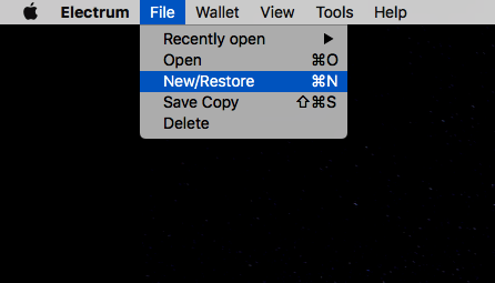 Electrumを導入したら左上のメニューバーから「New/Restore」をクリックします。