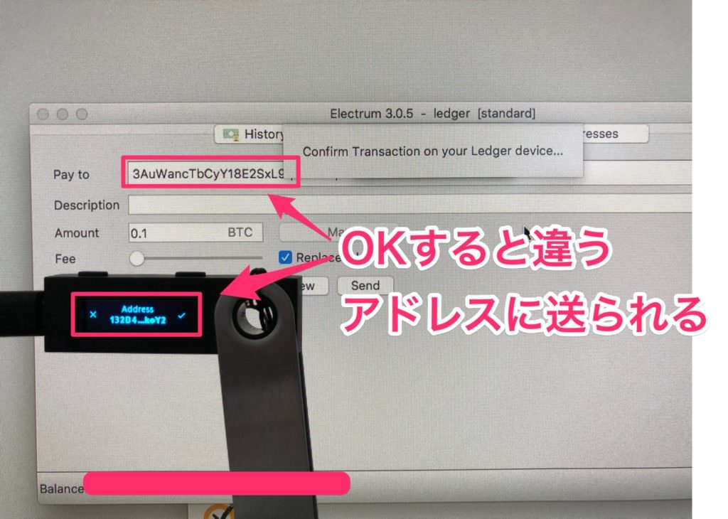 面倒ですがPCとハードウェアウォレットに表示されているアドレスの一致を毎回確認しましょう。
